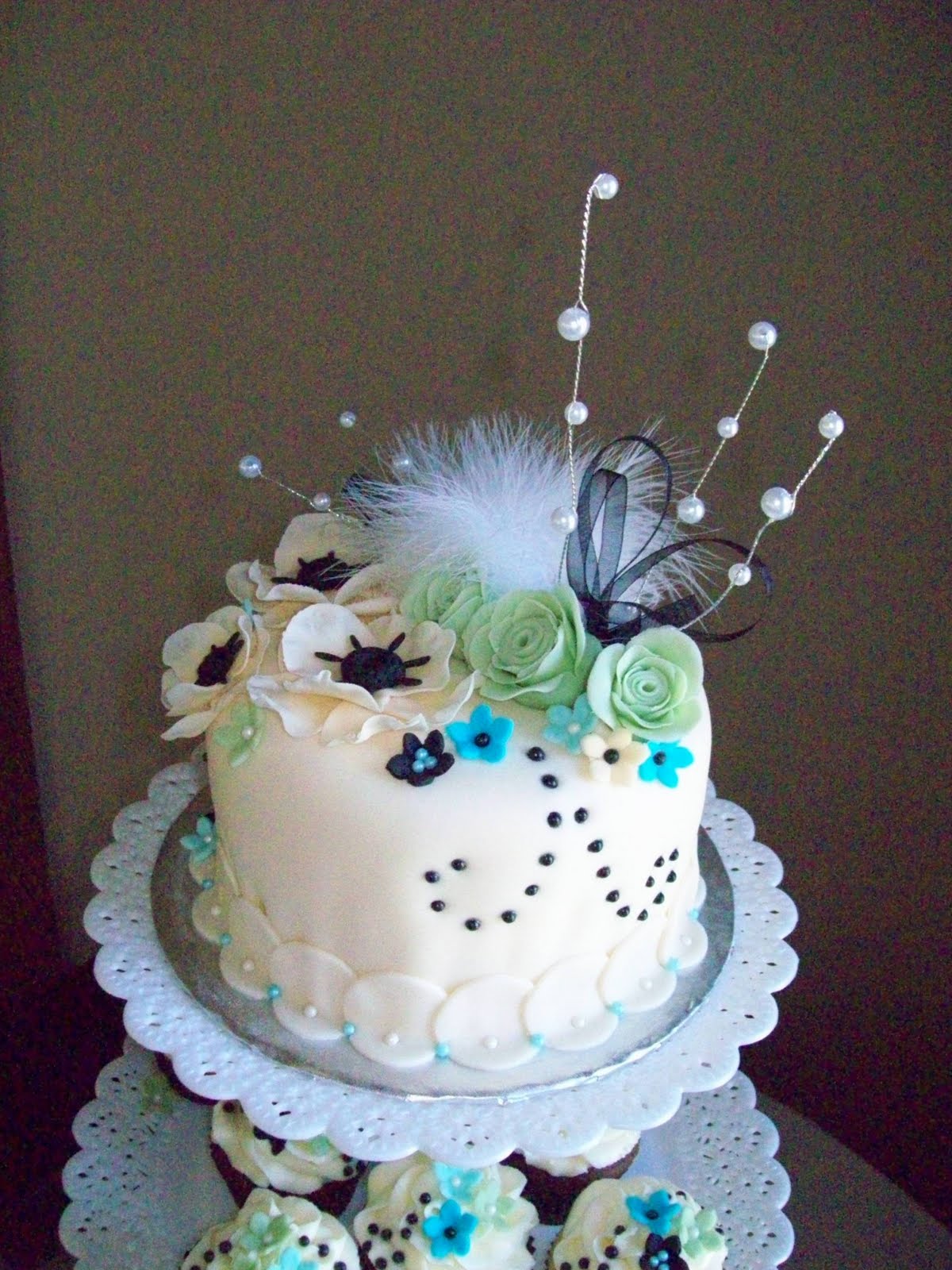 For this wedding project I was able to exercise my artistic license. My hairstylist requested 60 cupcakes and a topper cake for her retro inspired wedding reception. Her colors were cream, black and aqua. I was able to create a custom cake topper with feathers, pearls and fondant flowers to echo the birdcage veil that Jen would be wearing. I created about 200 five-petal flowers for the cupcakes and anemone and ranunculus flowers for the fondant covered 6" cake. I arranged black pearls on the cupcakes and cake in swirl designs to soften the look.